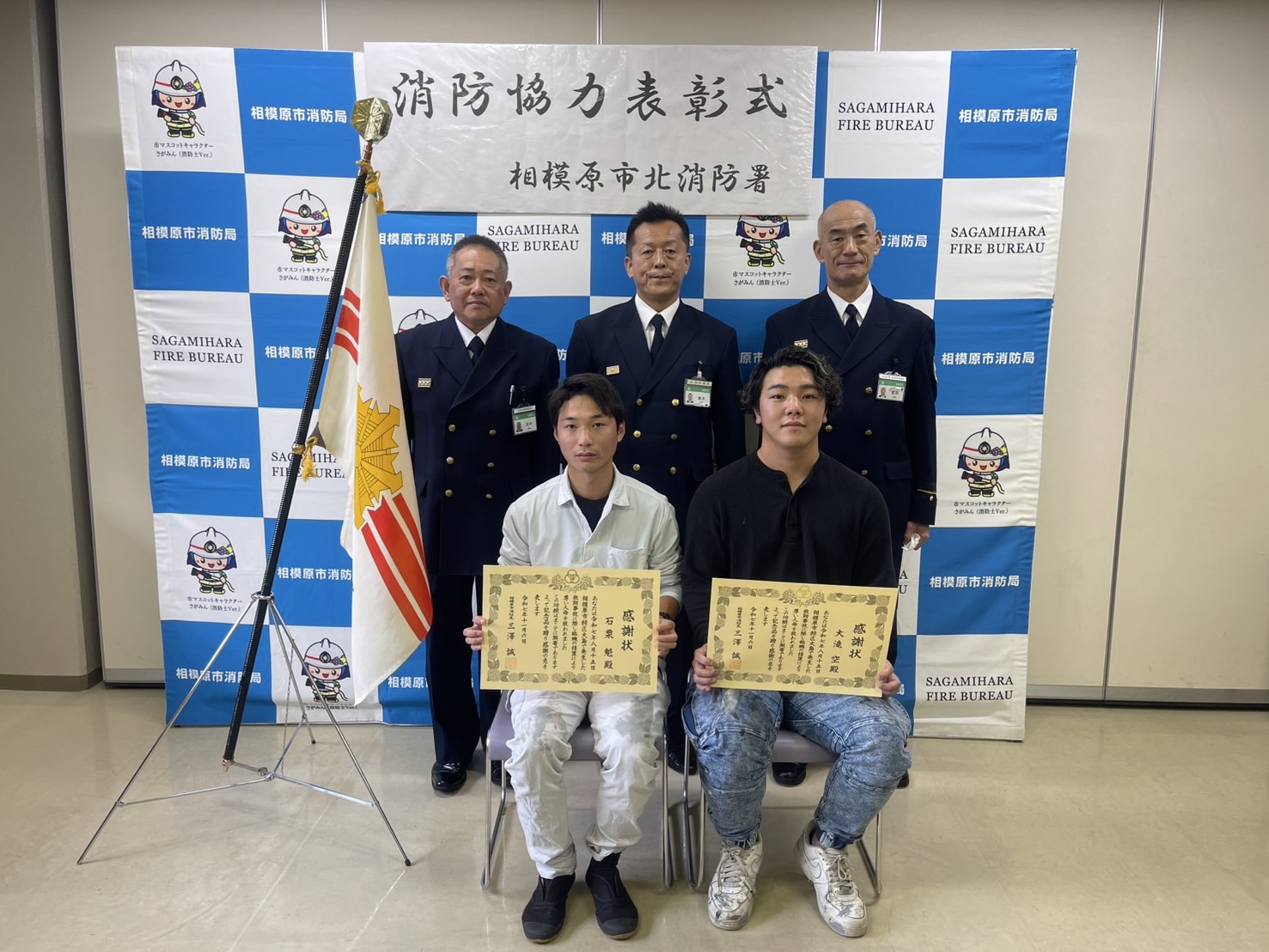 支えながら119番通報をしたとして、弊社の従業員2名が相模原市北消防署で表彰されました。